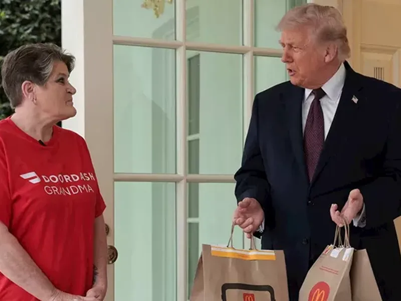 وبحسب مراسل "سي إن إن"، فإنه بعد لحظات من استدعاء ترامب للصحفيين مساء اليوم الأثنين، بشكل مفاجئ إلى الجناح الغربي، فتح الباب لتحية امرأة ترتدي قميصاً مكتوباً عليه "DoorDash Grandma"، وكانت تحمل حقيبتين كبيرتين من الطعام.